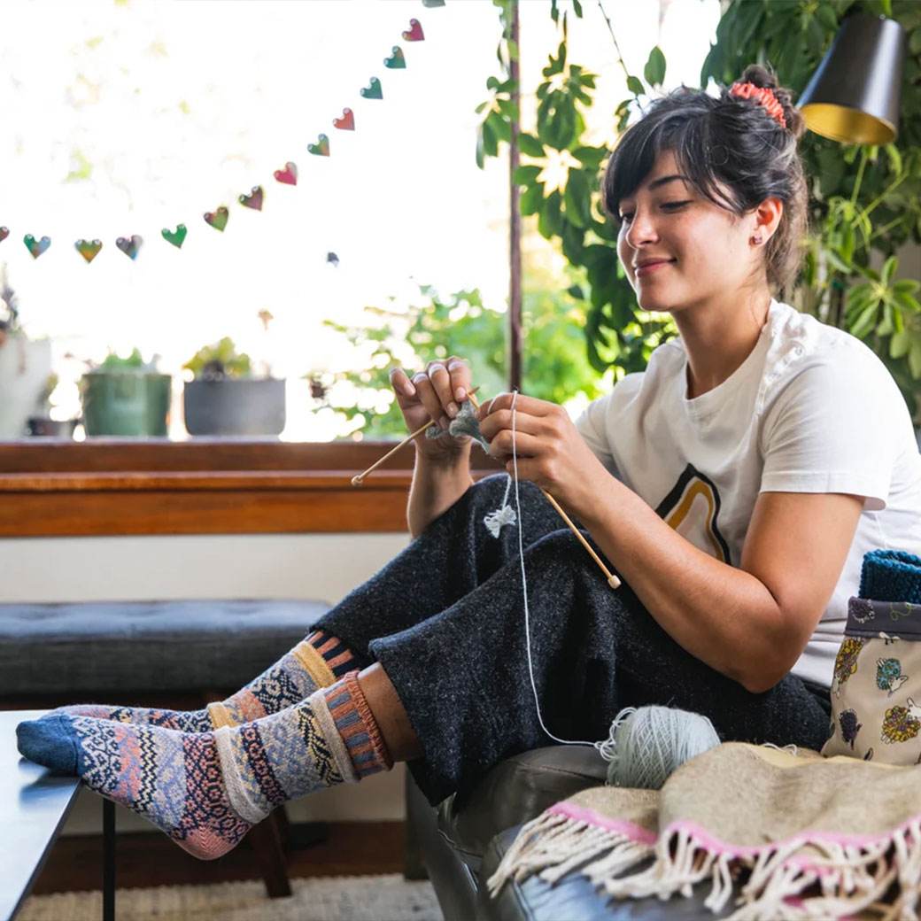 Solmate Socks(ソルメイトソックス)の靴下は、アパレル生産工場から出た余った布や中古衣料などの廃棄物をアップサイクルした再生糸を使用し、ノースカロライナ州ヒッコリーの小さな家族経営の工場で1つ1つ心を込めて生産されています。