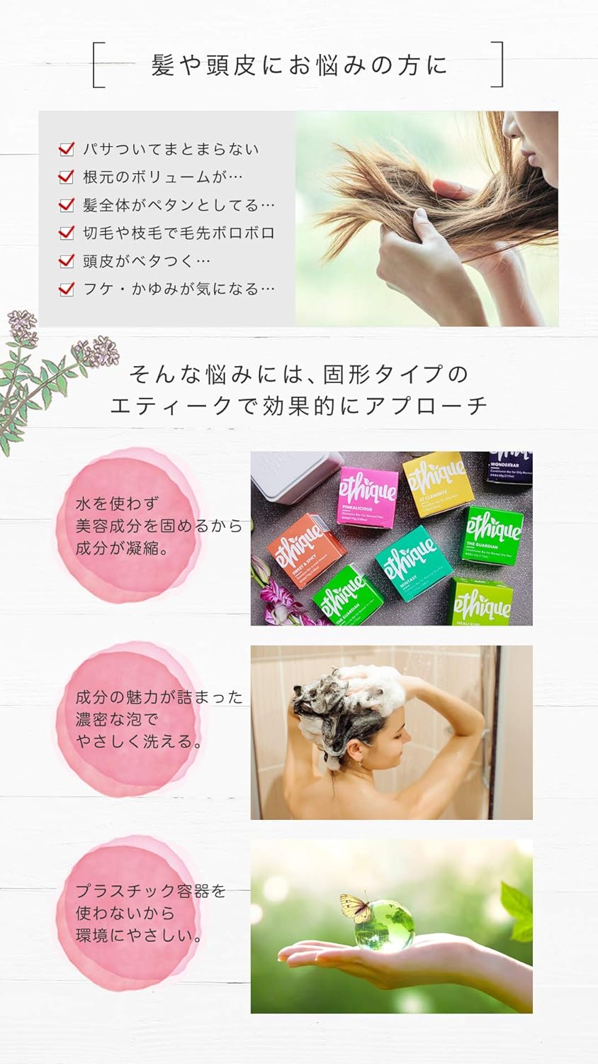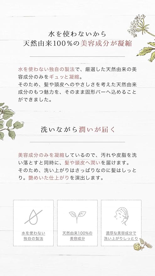 ココナッツオイル(ヤシ油)、カカオバター(カカオ脂)、パンテノールが乾燥しがちな髪と頭皮に潤いを与え艶やかな髪へ導きます。