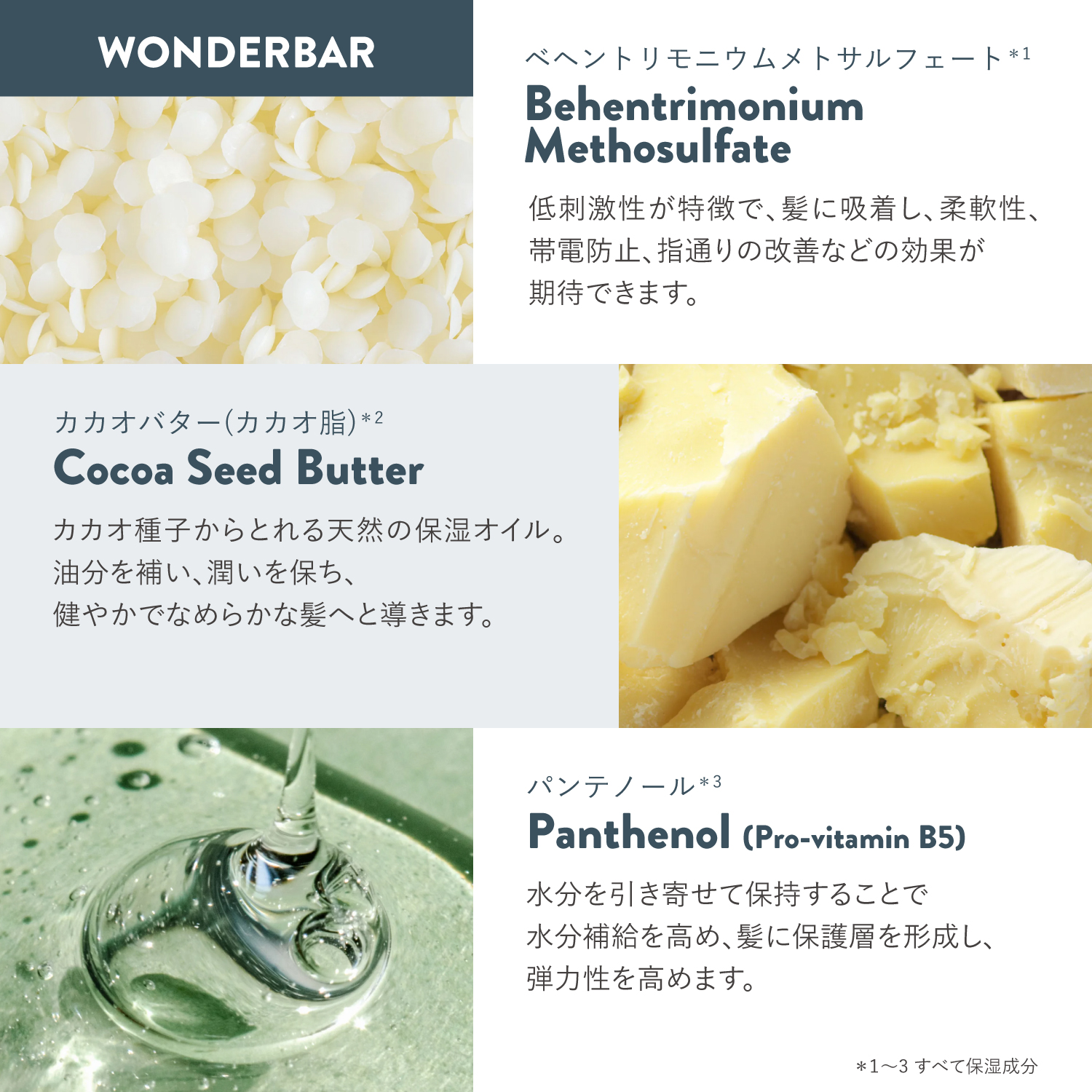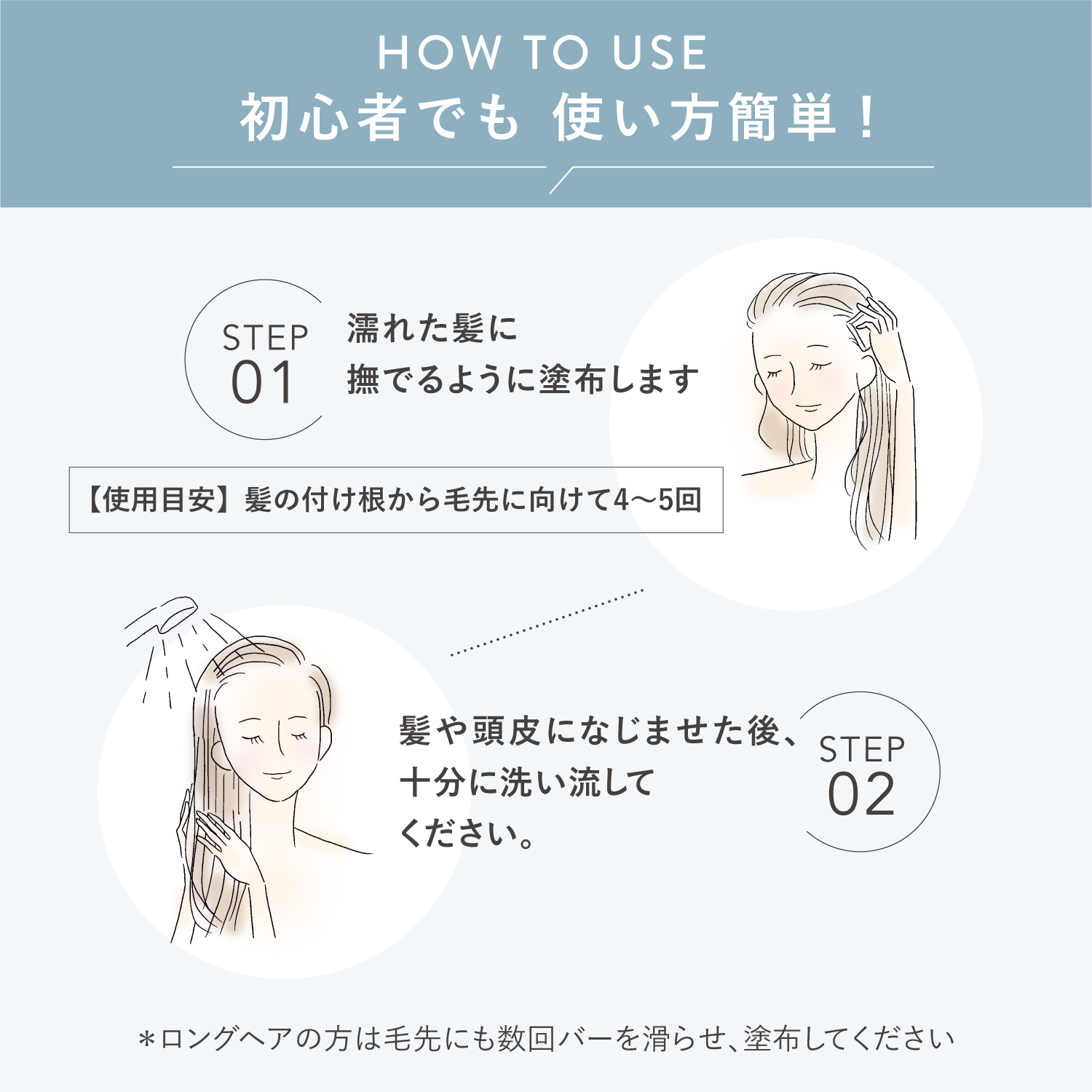 ギュッと濃縮したシンプルリッチな美容液成分が髪に浸透し 、うるおいのある指通りがツルっとしたなめらかな髪に導くコンディショナー バーです。
