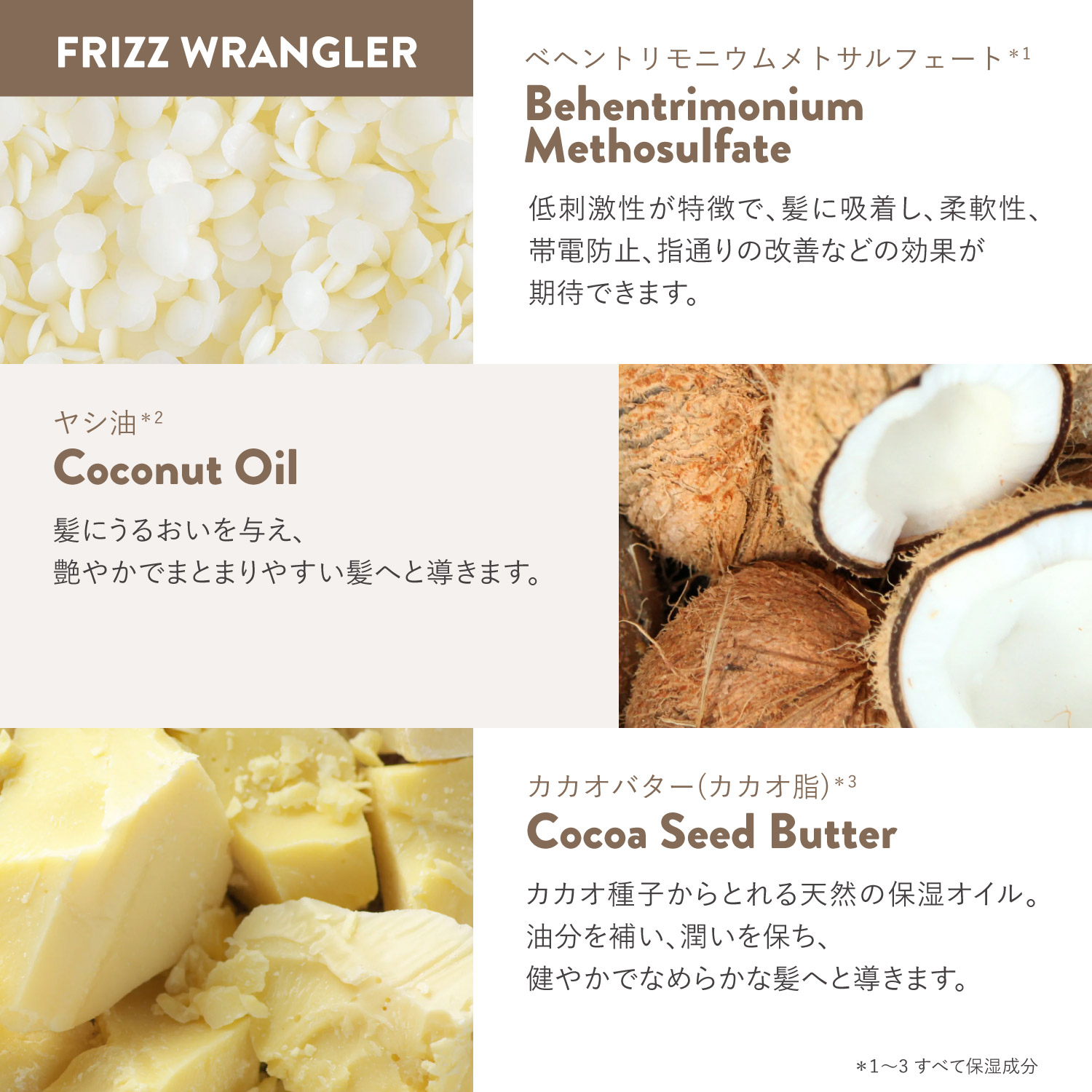 ココナッツバター*¹が乾燥して広がる髪をしっとりとまとめ、カールのボリュームを落とさず絹のようななめらかな髪に導きます。